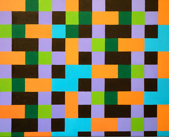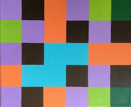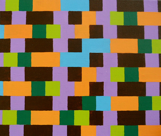 I also show the colour pattern paintings which in a sense are purely theoretical. They do not reference nature but do have a life of their own and are not random. I have used the same methodology to reduce the complexity by paring down the number of squares to see what happens.