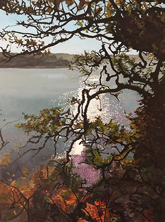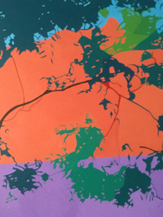 The images shown show the process at work. The first painting is purely tonal and mostly monochrome. Then the sequence of Tree paintings begins. I was taken by the sight of four trees along the banks of the millpond where we lived. The Four Trees painting is more about the exploration of the shapes in nature and involved my response to the complexity in the trees. In Two Trees, I took two of the trees and developed the shapes and then introduced colours I had already developed in my colour combination patterns. One Tree is another example. I have then selected details from these paintings to present the colours in new ways. The culmination is much larger canvases which can envelop the viewer. The painting moves towards the use of colour for its own sake but in fact references the world around us.